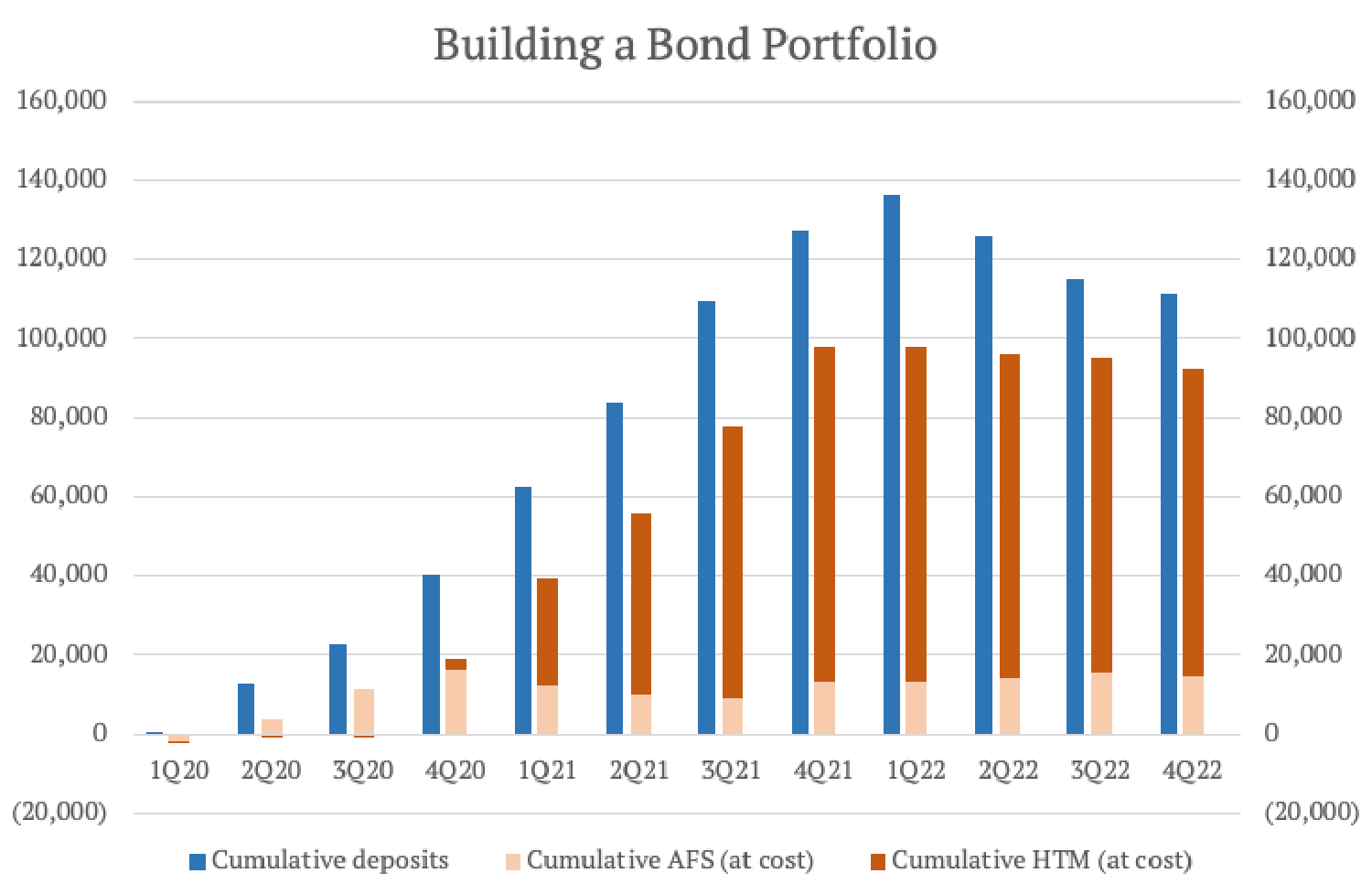 Большую часть этих вкладов банк инвестировал в ценные бумаги. Он принял двухстороннюю стратегию: укрыть часть ликвидности в ценных бумагах AFS с более коротким сроком погашения, и в то же время стремиться к доходности с помощью портфеля ценных бумаг HTM с более длительным сроком погашения. В стоимостном выражении портфель ценных бумаг AFS вырос с 13,9 млрд долларов на конец 2019 года до 27,3 млрд долларов на пике в первом квартале 2022 года; портфель ценных бумаг HTM вырос гораздо больше: с 13,8 млрд долларов до 98,7 млрд долларов. Часть прироста отражает перевод ценных бумаг на сумму $8,8 млрд из категории AFS в категорию HTM, но большая часть отражает рыночные покупки.