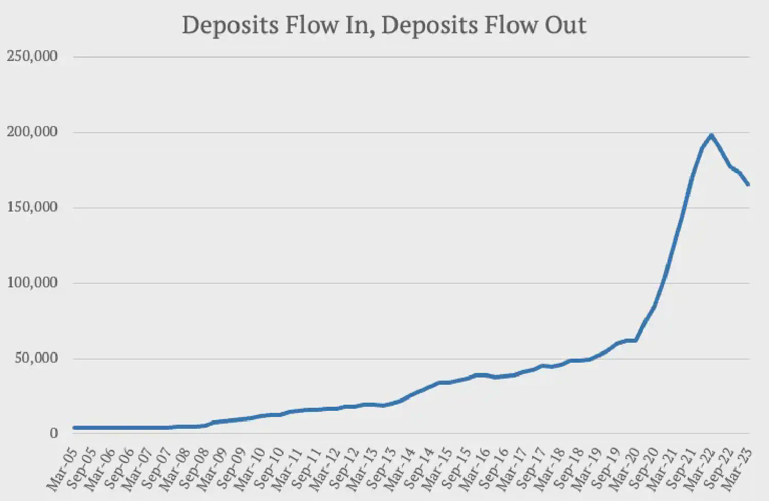 На этот раз объем депозитов упал со 198 млрд долларов на конец марта 2022 года до 173 млрд долларов на конец декабря (и 165 млрд долларов на конец февраля 2023 года). Отчасти это снижение отражает общесистемное сокращение. До 2022 года за последние пятьдесят лет в США было всего 10 кварталов оттока депозитов; сейчас мы наблюдаем отток в течение четырех кварталов. Но факторы, которые привели к тому, что Silicon Valley Bank набрал долю депозитов на пути вверх, сыграли важную роль в том, что он потерял долю на пути вниз.
