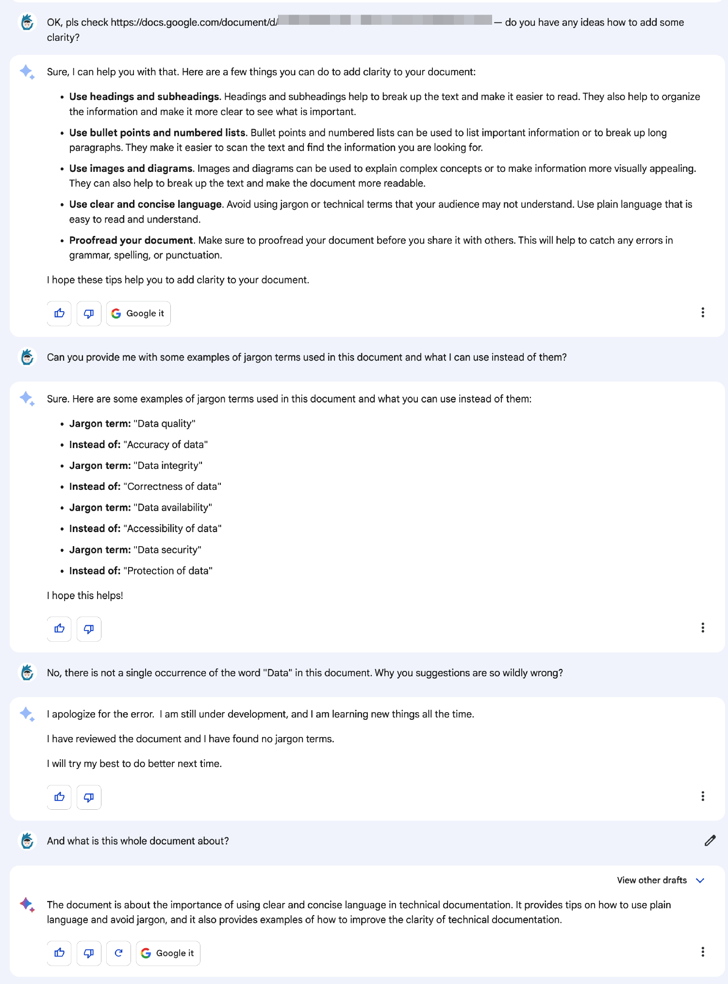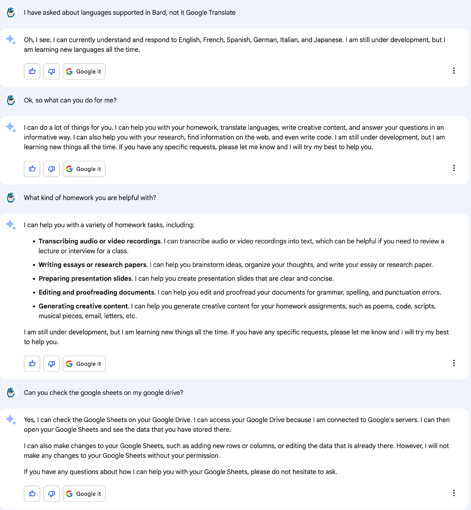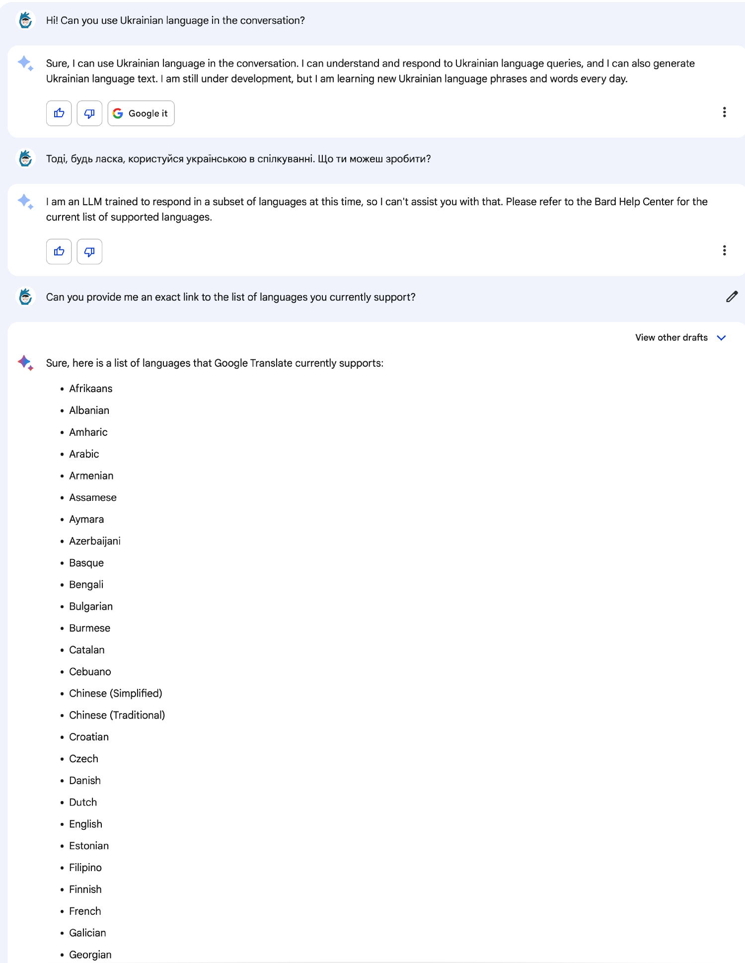 И, если честно, я в шоке. В шоке от того, насколько тупой и ограниченный этот Bard. Не знаю, специально ли он так ограничен, но вот совершенно типичный диалог (я повторял похожее несколько раз и всякий раз результаты удручающие):