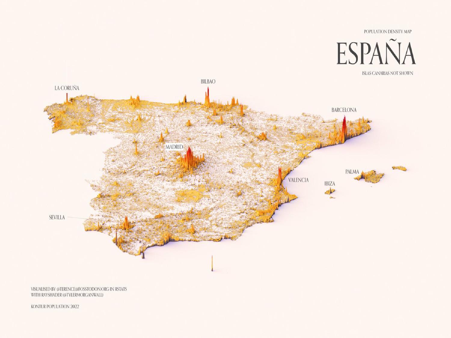 Здесь выделяются четыре крупных города — Мадрид, Барселона, Бильбао и Валенсия, но за их пределами плотность резко падает.