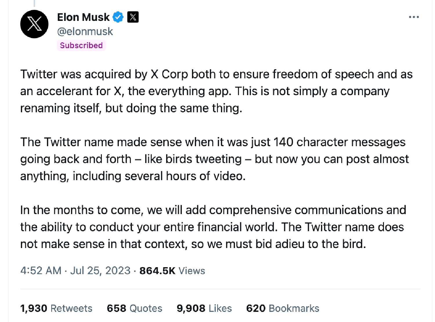 Маск уже выложил объяснение, что название Twitter имело смысл тогда, когда речь шла о текстовой сети из 140 символов, а сейчас, когда вы можете даже видео выложить, а уж в будущем, когда приложение станет вашим ключом к финансовому миру, в этом контексте название не имеет смысла и с птичкой следует попрощаться.