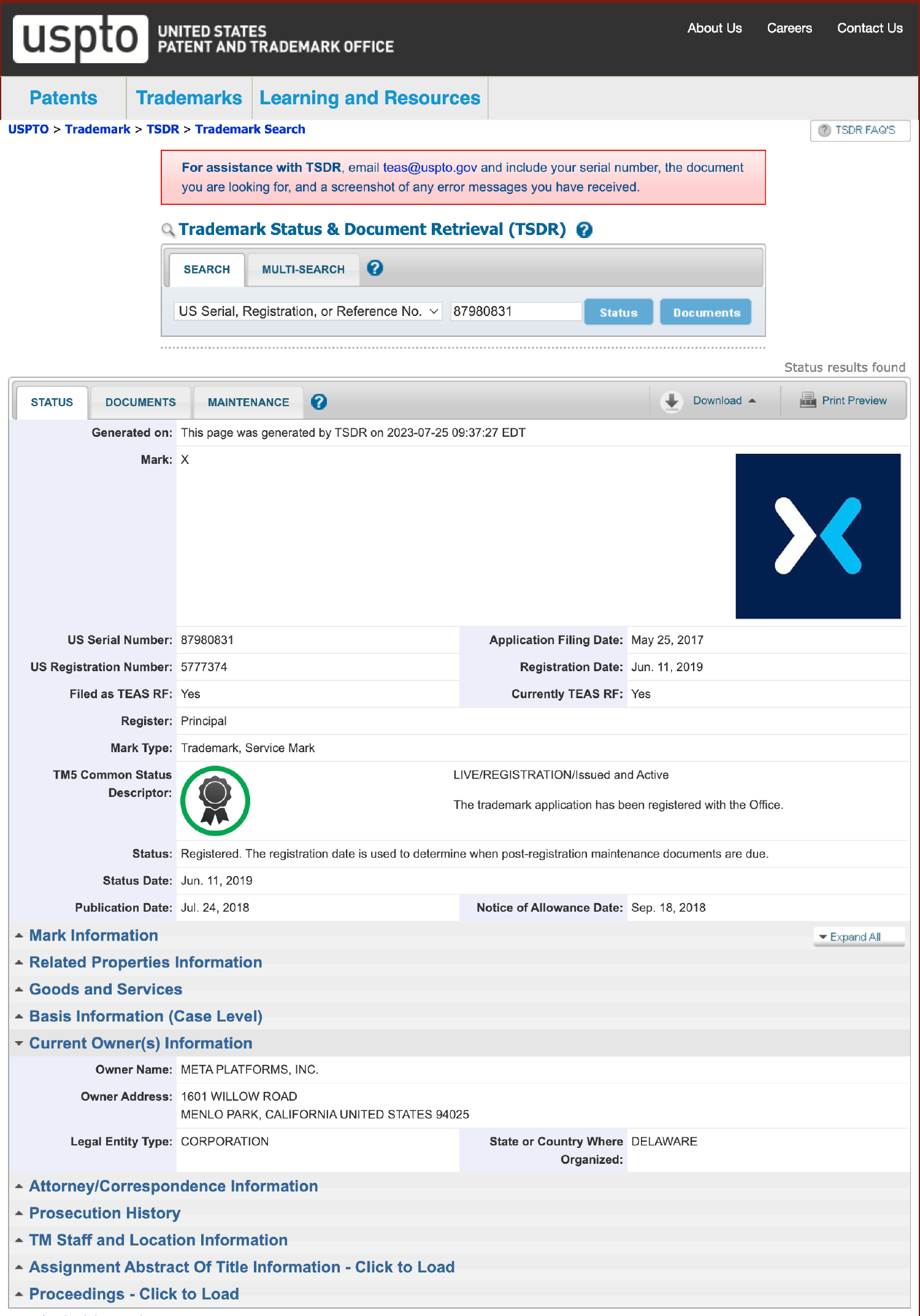 Еще одна показательная для стиля принятия решения Маском черта — оказалось, что новый бренд, мягко говоря, сомнителен в плане копирайта. Например, в Японии соцсеть не сможет использовать новое название, поскольку X Japan — это название популярной рок-группы, существовавшей под таковым с 1992 года. Но что еще симпатичнее — изображение косого креста и названия X в области online social networking services и вообще всего, что может относиться к программному обеспечению, вебсайтам, онлайн-рекламе, стримингу, вещанию и так далее, в США является зарегистрированной торговой маркой и права на неё принадлежат … Meta Platforms, Inc.