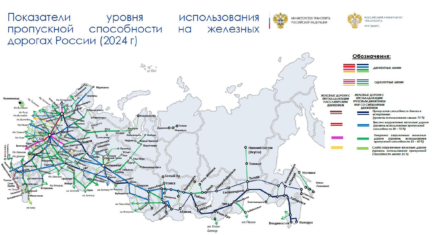 В общем, и причины ровно те же — большое количество грузопотока переориентировалось на порты Дальнего Востока (поскольку экспорт через Балтийское море и в Европу осложнен санкциями) и банально не проезжает туда из-за перегруженности Транссибирской магистрали. Вот, кстати, красивая иллюстрация к тому, как теперь выглядит загрузка направлений и учтите, что загрузка более 75% по определению ведет к резкому увеличению непроизводительных простоев и расходов — математику в виде прикладной теории массового обслуживания никакая суверенная демократия обмануть не способна.