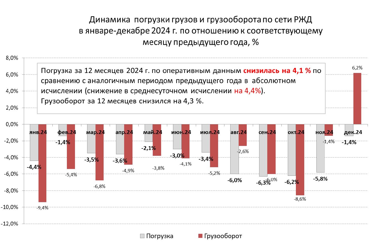 После наблюдений в течение года за показателями российских железных дорог логично посмотреть и на итоги 2024 года. Впрочем, тут никаких неожиданностей — погрузка за 12 месяцев составила -4,4% к показателю 2023 года, при этом показатель грузооборота, скачущий в разные стороны, иллюстрирует нерациональность перевозок. Физически это означает, что меньшее количество грузов везут на большее расстояние.
