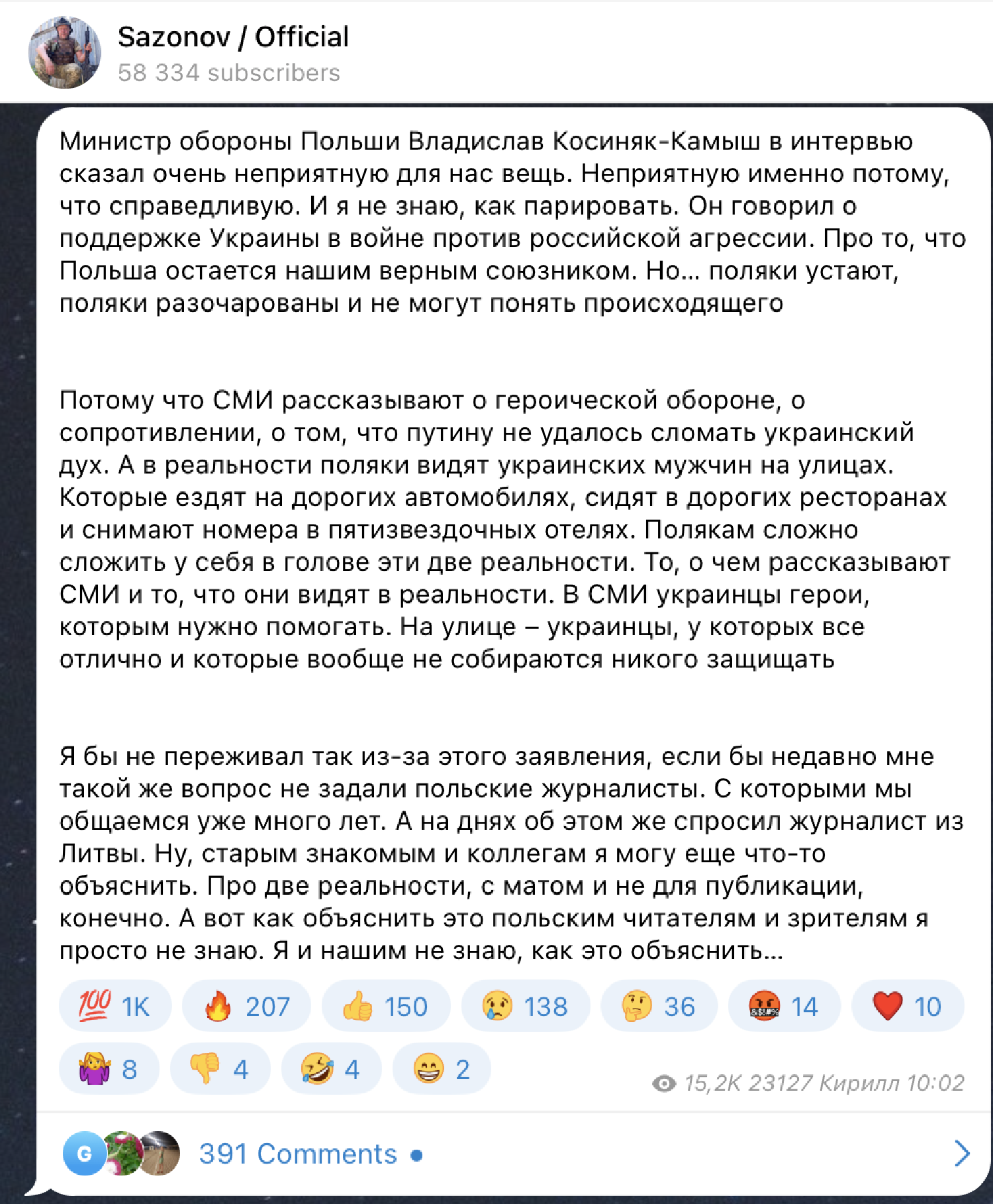 При всем уважении к Польше и полякам и с благодарностью за оказанную помощь, все же никак не могу понять и объяснить — почему в полонезе “Прощание с родиной” Михала Огинського, участника восстания Тадеуша Костюшко, нет ни слова про готовность умереть на своей земле за ее независимость от России, и как сам Огиньский стал через несколько лет сенатором Российской империи? Как и тот факт, что начало формирования польской диаспоры в США датируется 1860-мы годами, то есть как раз, когда полыхнуло январское восстание в Польше (1863-1864 годы).