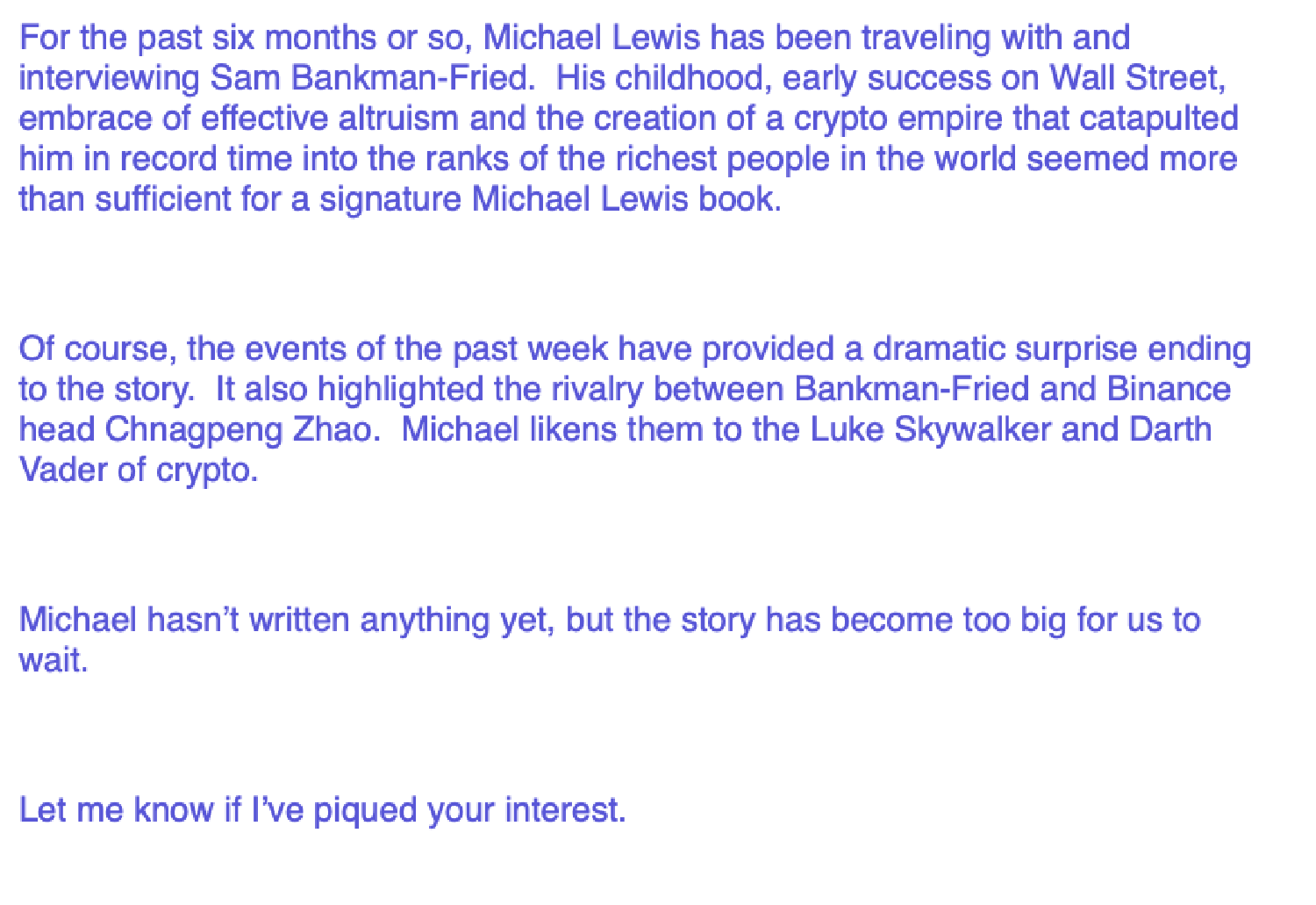 Сообщают, что последние полгода Майкл Льюис много встречался и брал интервью у Сэма Банкмана-Фрида, основателя FTX. Одно из изданий получило доступ к письму агента Майкла, которое тот написал ведущим издательствам.