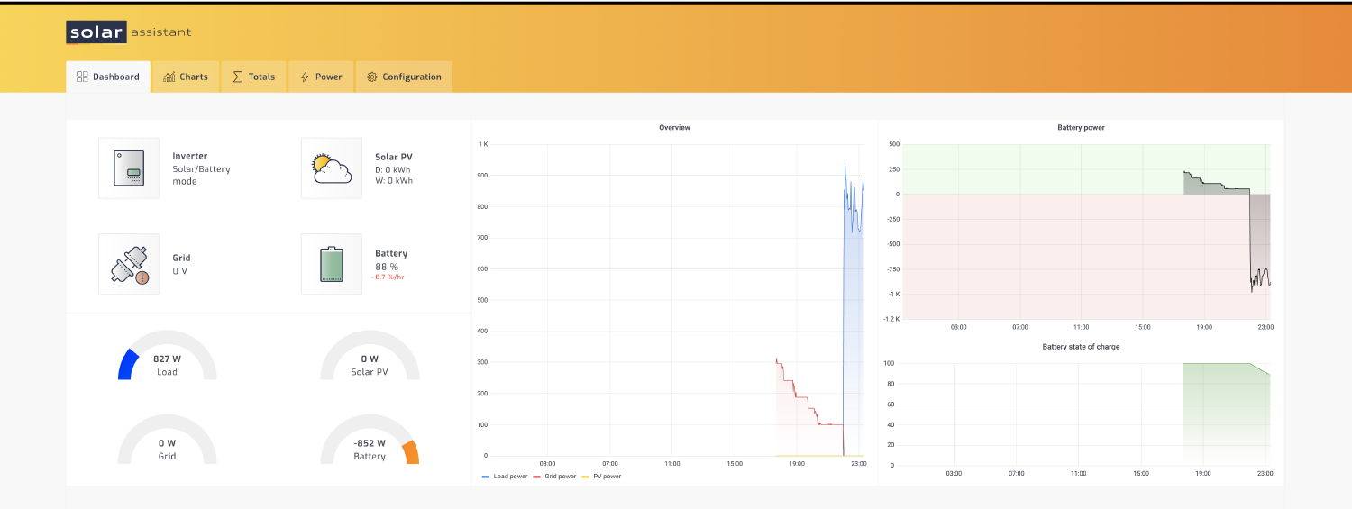 Результаты на скриншоте выше — вместо малопредсказуемой capacity показывается логичное и понятное значение State of Charge, на данный момент более часа система питает весь дом и израсходовано 12% емкости.