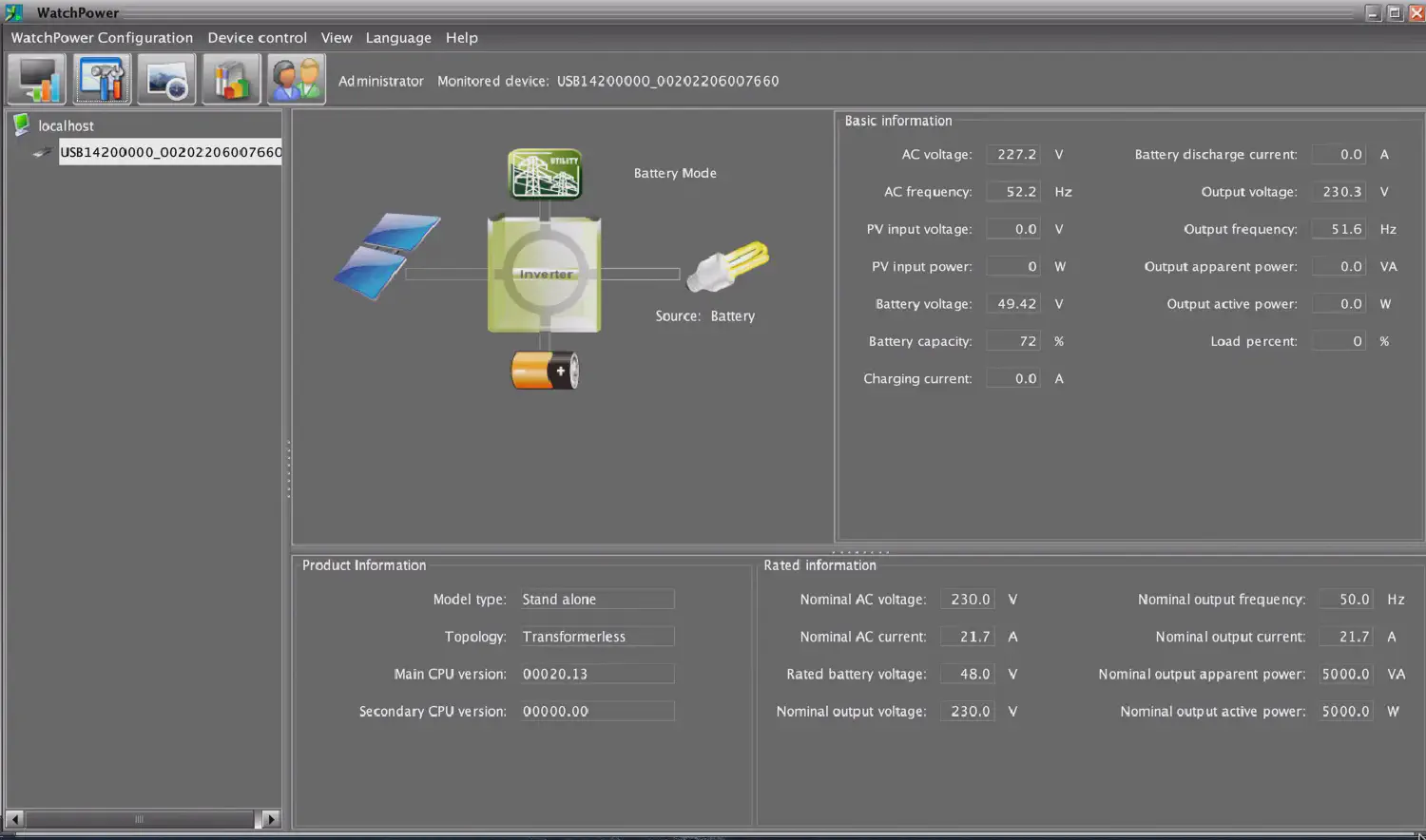 А вот как раз возникло. Уже полтора года я пользуюсь системой с инвертором и набором батарей для обеспечения энергонезависимости — или, попросту говоря, чтобы при регулярных отключениях электричества замечать это как можно меньше. Инвертор вполне справляется с этой задачей, батареи прекрасно работают, но всё это время мне мешало отсутствие нормального решения для мониторинга системы — вроде бы всё в нем умное, но недостаточно, модель инвертора не имеет поддержки wi-fi, удаленно посмотреть невозможно, получилось только подключить к инвертору ноутбук, водрузить на него кросс-платформенное, то есть страшное и глючное, поделие под названием WatchPower. Соответственно, чтобы посмотреть состояние инвертора, приходилось ходить удаленно на ноутбук (или приходить к нему ногами), но это полбеды.