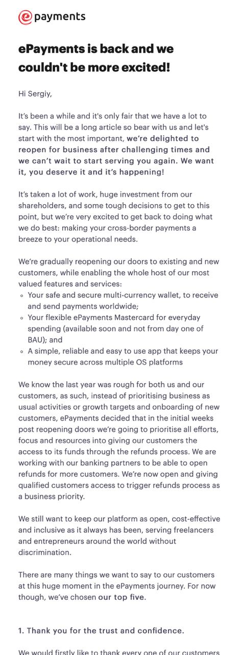 Платежная система ePayments после почти двух лет после прекращения работы по требованию британского регулятора сообщила, что они наконец получили все необходимые разрешения возобновить работу и начинают постепенное возвращение к предоставлению сервисов своим пользователям — функционирование электронного кошелька, возобновление работы платежных карт и так далее.
