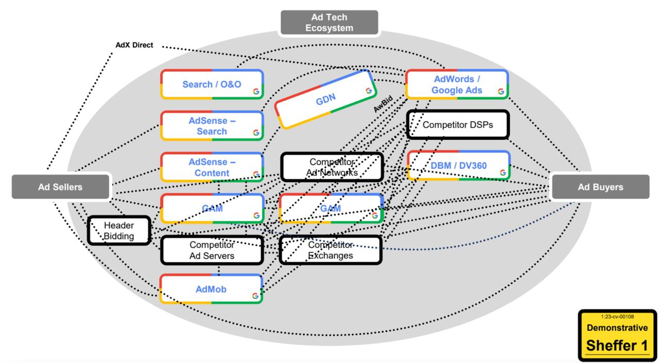 Суть претензий Минюста (и поддерживающих обвинение прокуроров штатов) нам хорошо известно — Google обвиняется в том, что он, используя своё доминирующее положение на рынке рекламы, принуждает площадки и рекламодателей использовать свои рекламные инструменты — AdX и DoubleClick for Publishers. Правительство ссылается на внутренние документы Google, где один из топ-менеджеров задаётся вопросом “Не выглядит ли это, как если бы Goldman Sachs или Citibank владели Нью-Йоркской фондовой биржей?”. В суде уже давали показания представители площадок, включая крупные издательские дома, и конкурентов, как, например, OpenX, которые рассказывали, что из-за огромных размеров и возможностей Google с ним невозможно не сотрудничать.