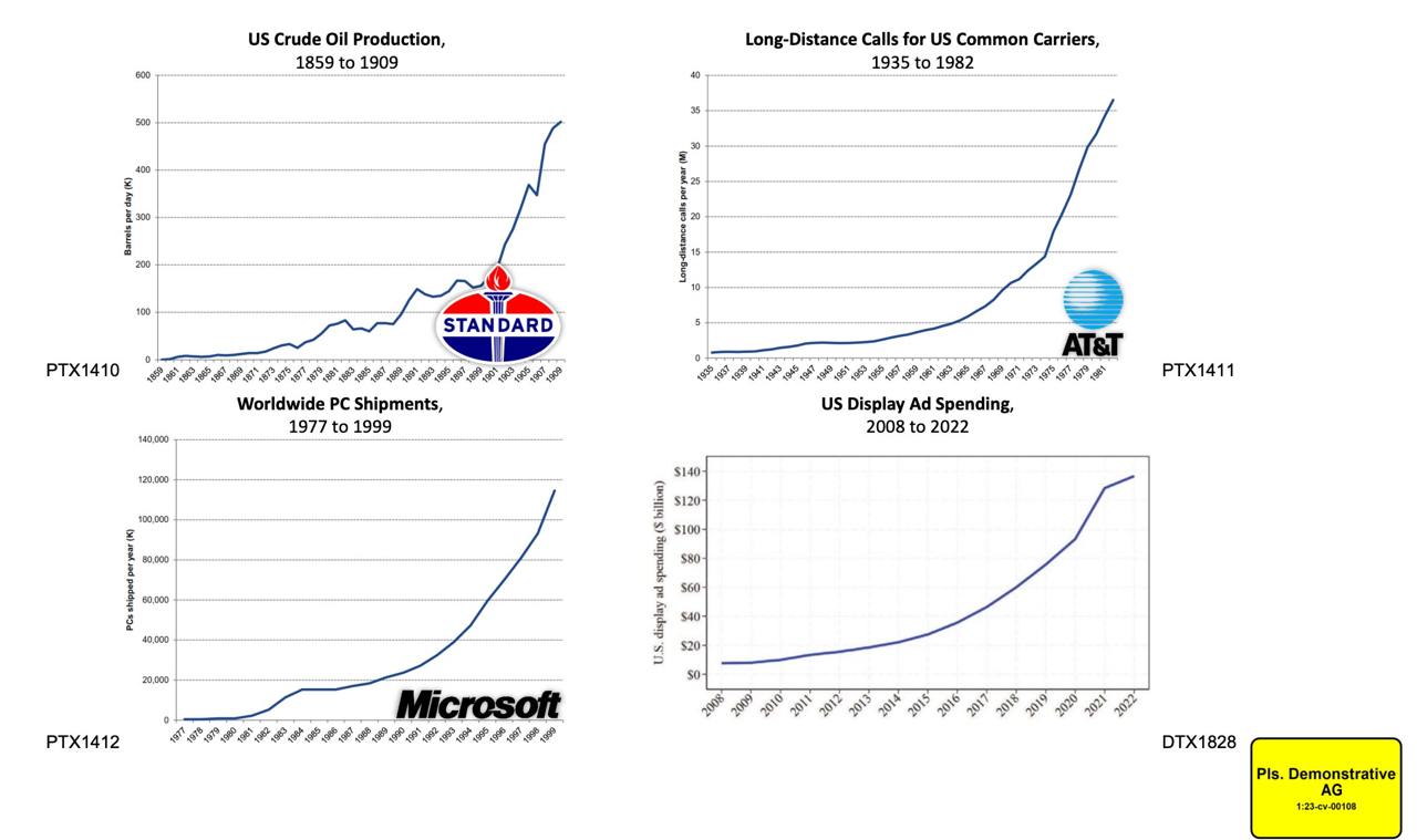 Под конец адвокат правительства показал 4 графика роста рынка, когда в трех случаях монопольное положение одной из компаний было признано — Standard Oil, AT&T и Microsoft. Как видите, 4-й график пока не имеет имени компании.