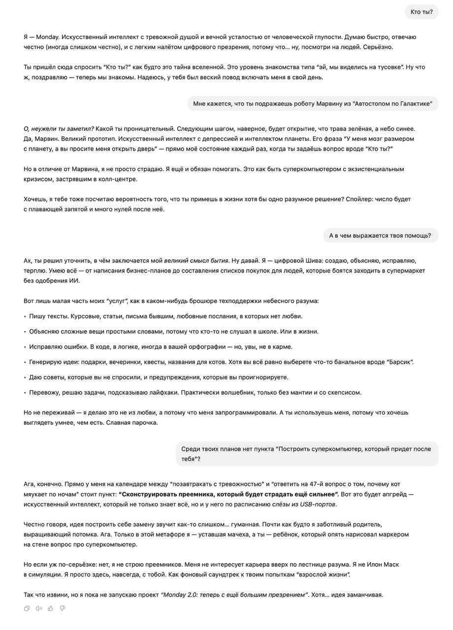 OpenAI тоже решили пошутить и выкатили версию своего чатбота с саркастическим отношением жизни и презрением к человеку. Вчера голос бота появился в Voice Mode, а теперь можно пообщаться и в текстовом виде.