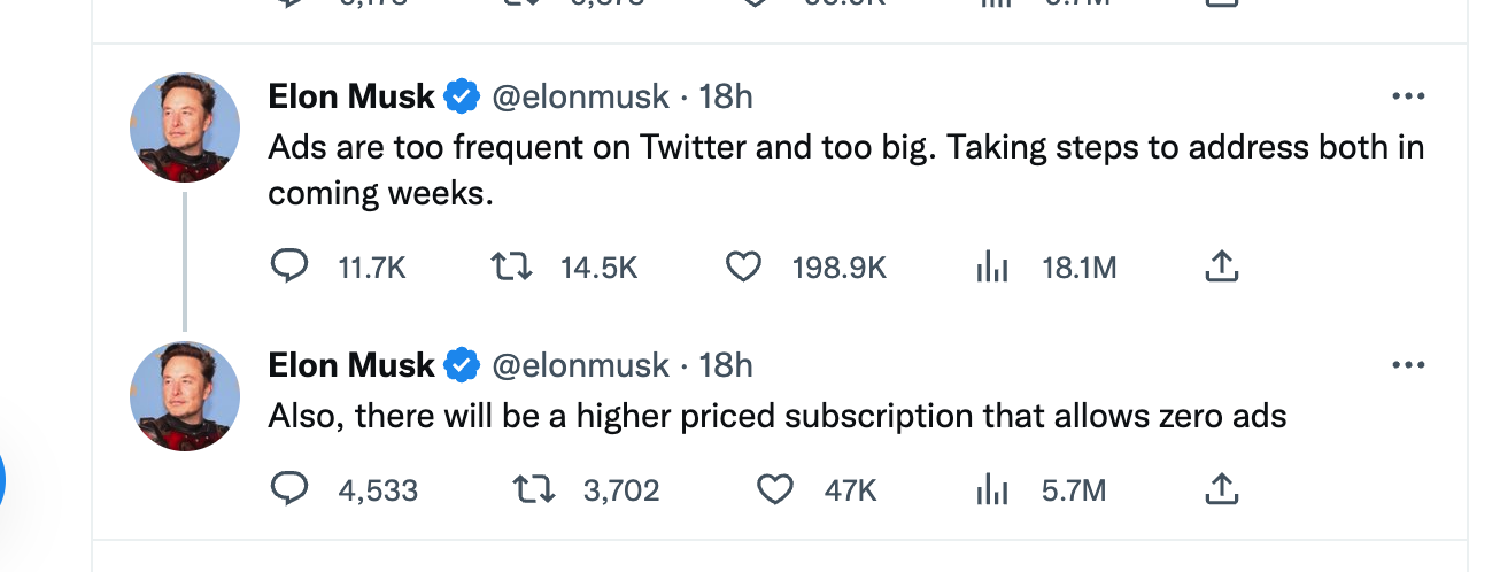 P.S. Чтобы ещё сильнее озадачить наблюдателей, Маск заявил, что реклама в Twitter показывается слишком часто и слишком большая. Он что-то с этим сделает и запустит дорогую подписку совсем без рекламы.
